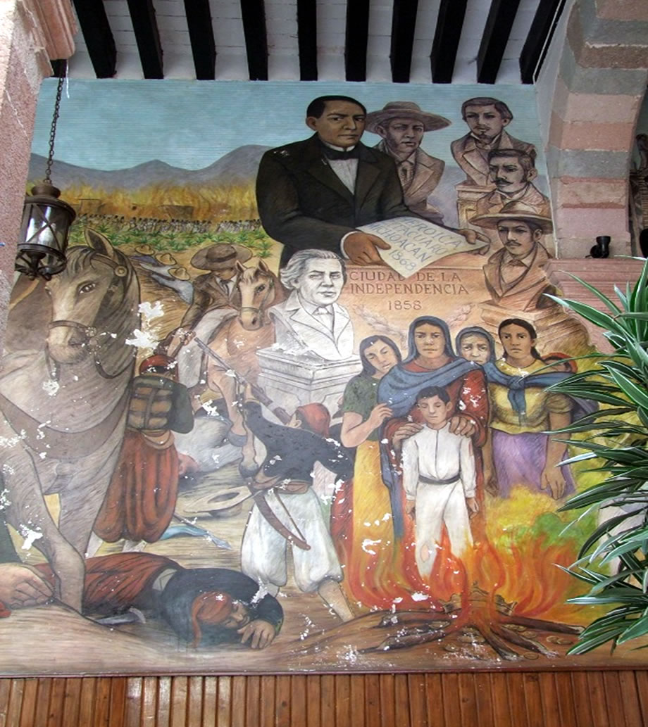 En la parte superior aparece el Presidente Juárez sosteniendo en sus manos el decreto del 20 de abril de 1868 expedido por el Gobernador Justo Mendoza por el cual se mandó que se le llamase Heroica Zitácuaro. También se marca la ley del 17 de noviembre de 1858 que le dio a la villa de San Juan Zitácuaro el título de Ciudad de la Independencia, abajo aparece un busto del Lic. Melchor Ocampo del que se celebra este año (2014) el bicentenario de su nacimiento