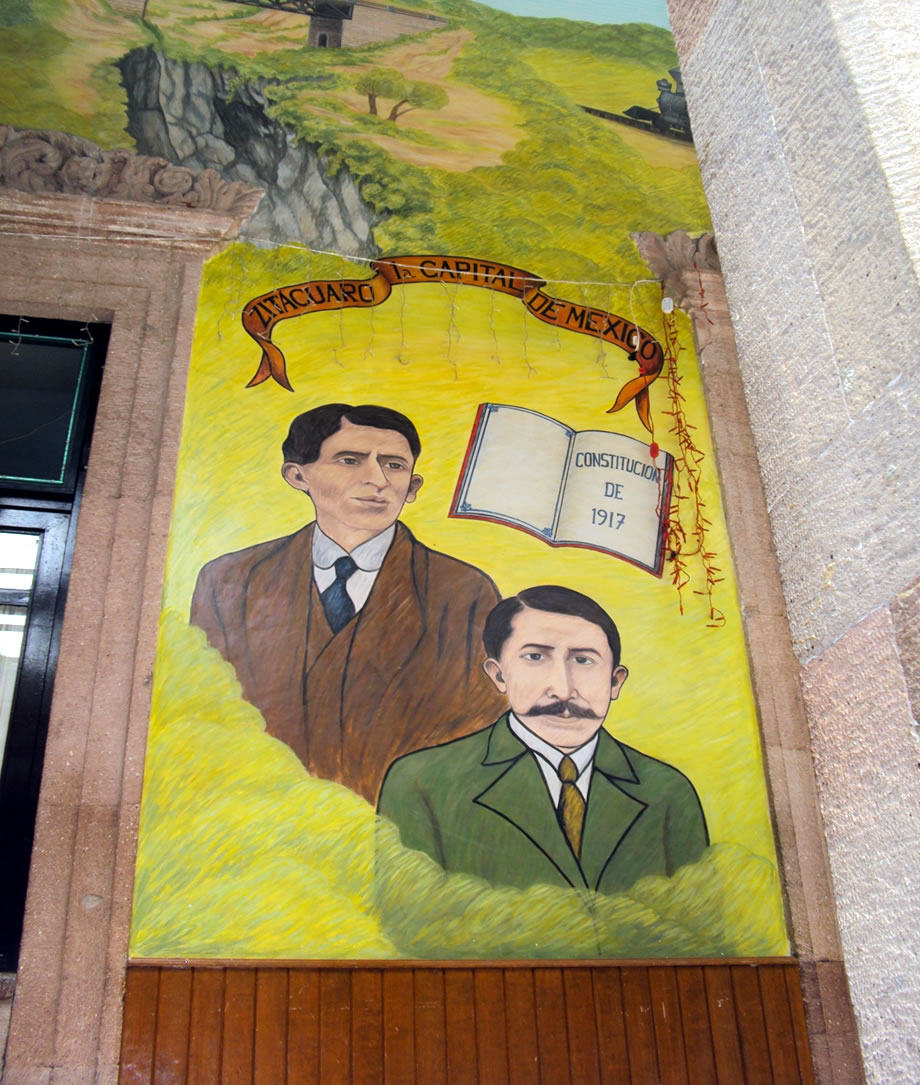 Diputados Constituyentes Onésimo López Couto y Uriel Avilés Maya. En la 3ª sección aparece un Ferrocarril dirigiéndose a las poblaciones de Ocampo y Angangueo, tirando los vagones la vieja máquina conocida como “La Pioja”, ferrocarril que hacía las delicias de chicos y grandes al pernoctar, en la Estación del Ferrocarril de Zitácuaro donde se localiza la bella construcción denominada Casona de la Estación.