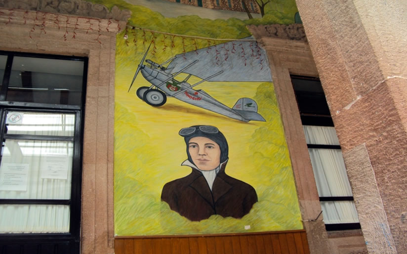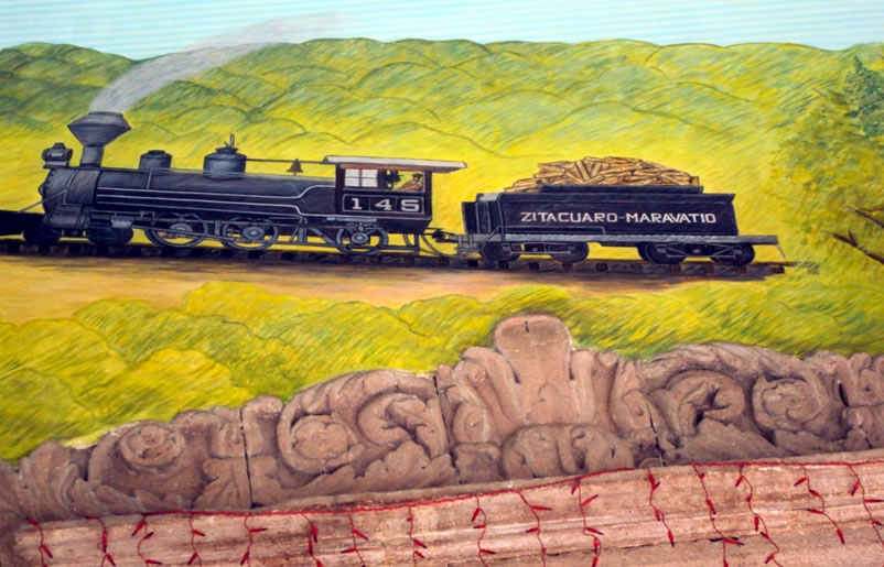 En la parte inferior se localiza el avión “El Pinocho” ideado y piloteado durante la década de los treinta del siglo pasado, por Miguel Carrillo Ayala, con el que voló sucesivamente, de Zitácuaro a Morelia y a México, guiado únicamente por las vías del ferrocarril.