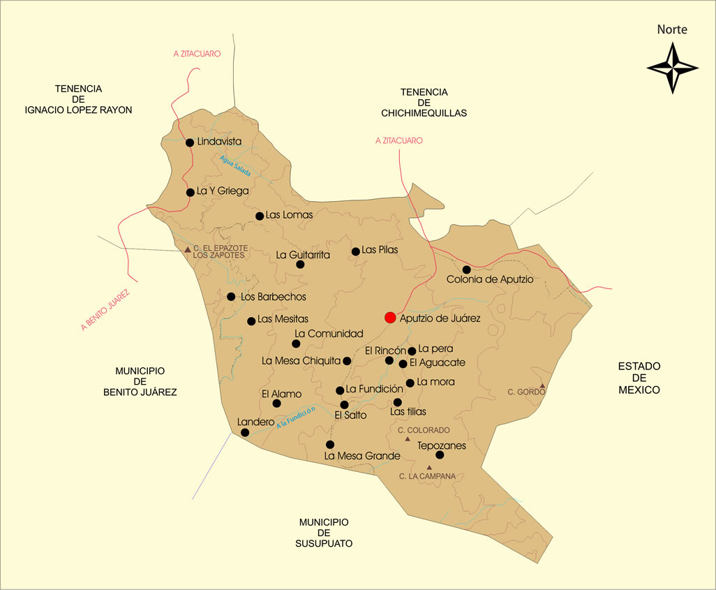 Orografía.- Aputzio de Juárez cuanta con los cerros de El Epazote, la Cruz, El Gordo, el Colorado, El Molcajete.