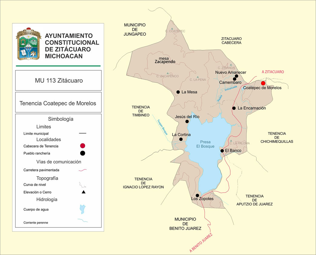 Esta tenencia es una de las más grandes del municipio; dada su cercanía con la cabecera municipal cuenta con terrenos que se utilizan para asentamientos urbanos: La Cuesta, La Colonia y Camémbaro en la parte norte y la Garita y la Encarnación en la parte sur. Camémbaro es la Manzana de mayor extensión y comprende gran parte de la Sierra de Zacapendo (norponiente del territorio municipal).