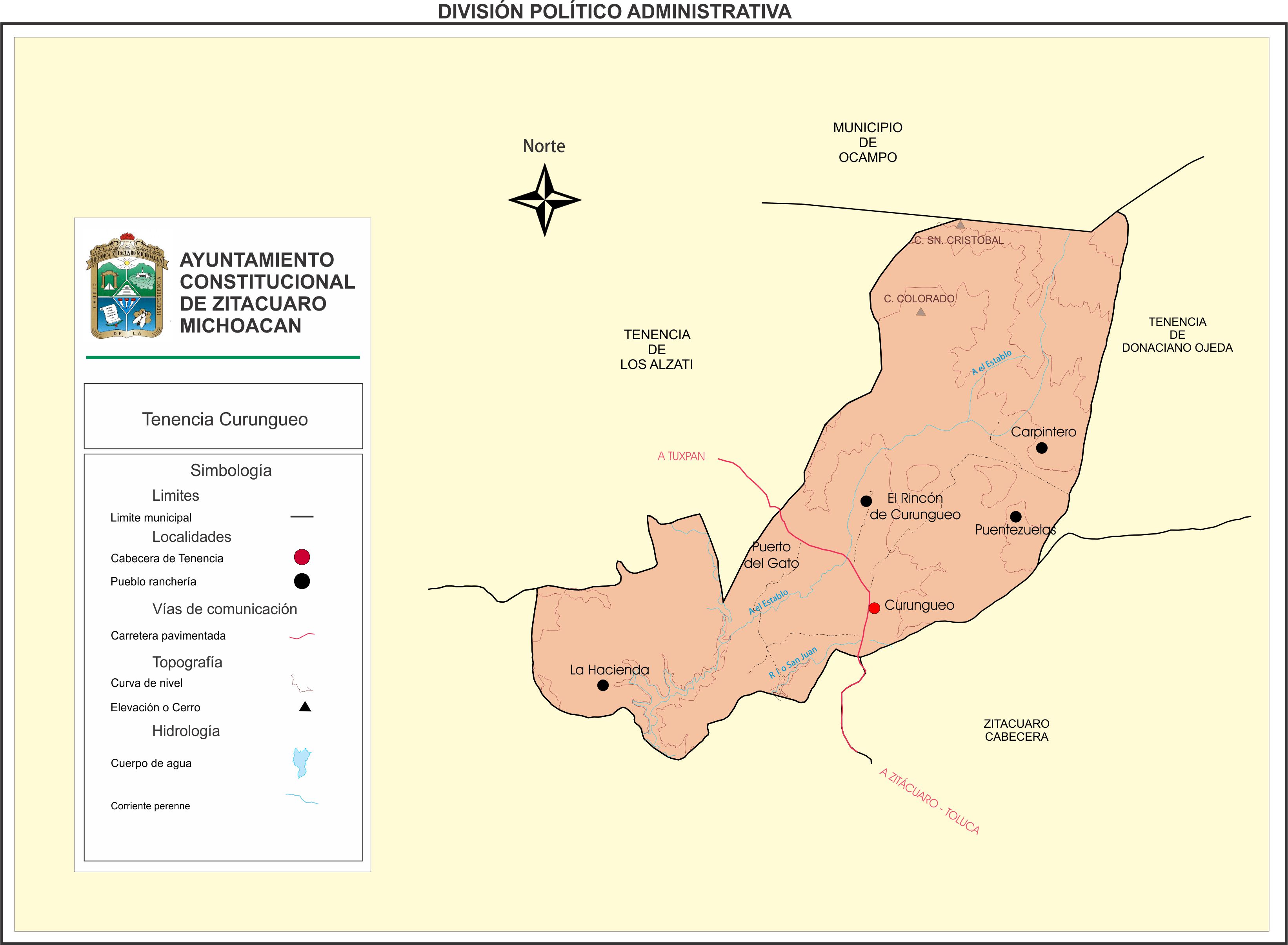 Respecto a la división política, la Tenencia de Curungueo se integra por cuatro manzanas: 1° Pueblo de Curungueo, Juzgado Viejo, Valle Verde, El Granjeno y la Gironda; 2°, Rincón de Curungueo y la Mesa de Bechi; 3° Pontezuela y Sombrerete; 4°, Loma Larga, La Mesa de Loma Larga y el Ejido Las Palmas, El Puerto del Gato..