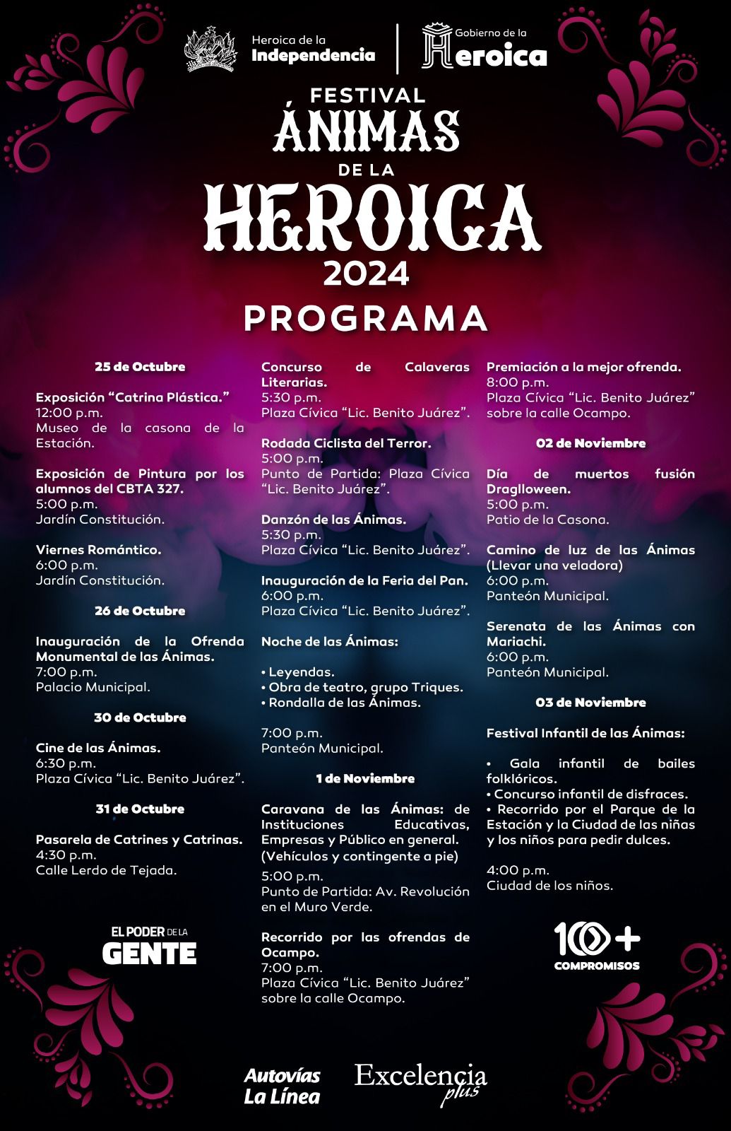Zitácuaro, Mich., a 24 de octubre del 2024.- Del 25 de octubre al 3 de noviembre llega el Festival Ánimas de la Heroica a Zitácuaro. Artistas locales, grupos culturales y distintos espacios públicos vestirán la celebración para recibir a los fieles difuntos, como parte de la tradición que preserva el gobierno de Juan Antonio Ixltáhuac.